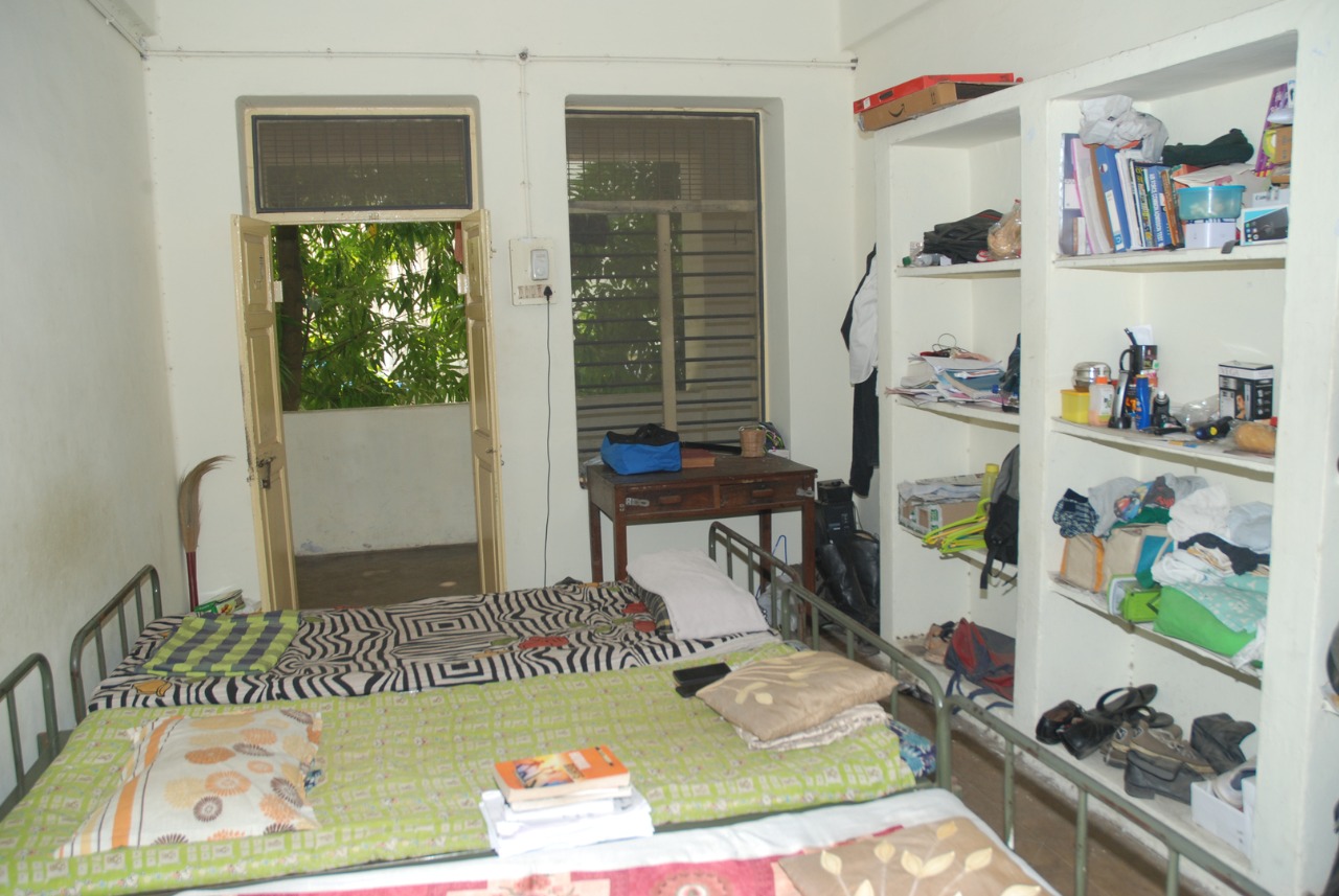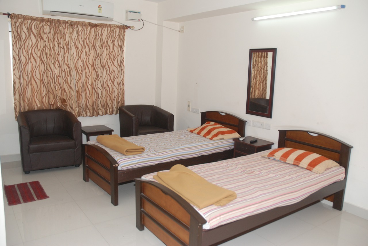 Our Guest House Interior view. Fully furnished with AC facility. Each room has two beds. Separate cub board, table, chair etc. are available. TV is also fixed.